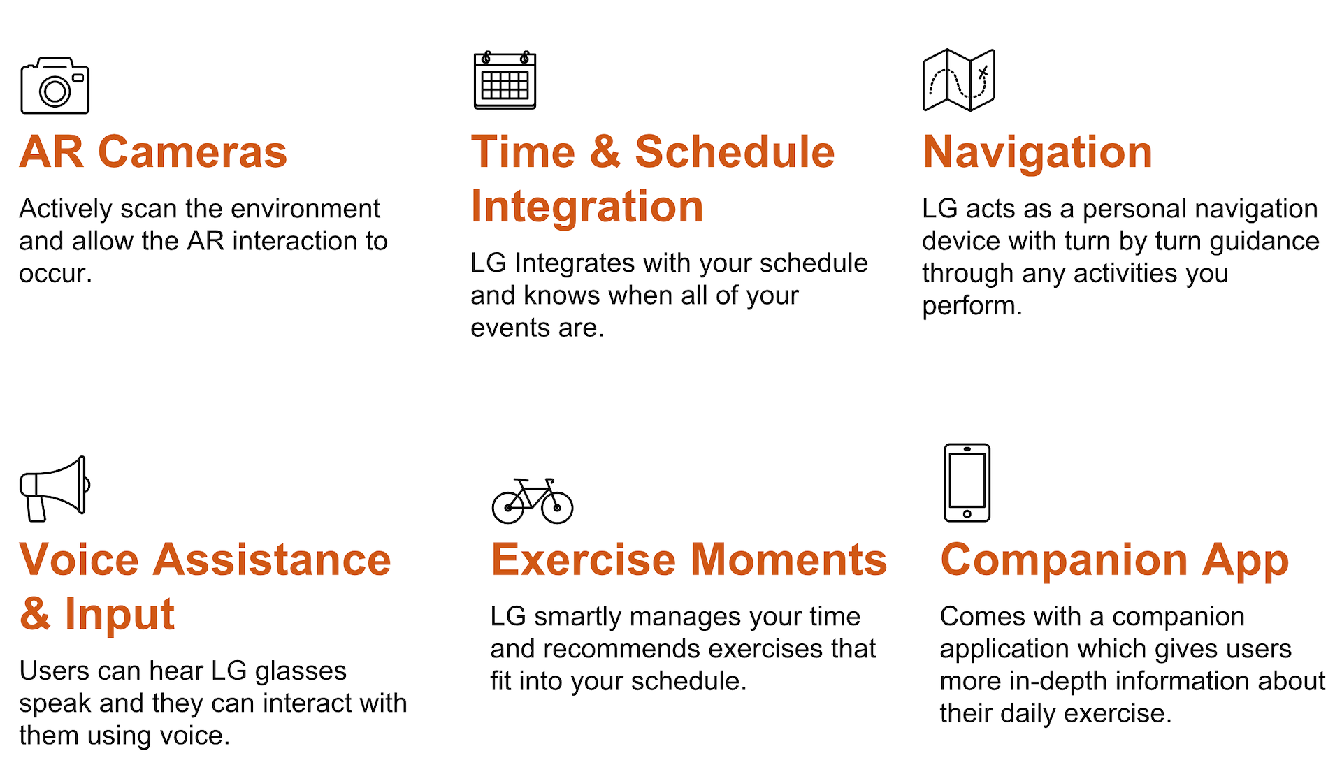 The product would use computer vision, machine learning, and AR technology to recommend moments of exercise and alternative paths that the student could take. The exercises that LG recommends can be seen in the world as 3D objects that guide the user on how to complete those exercises.