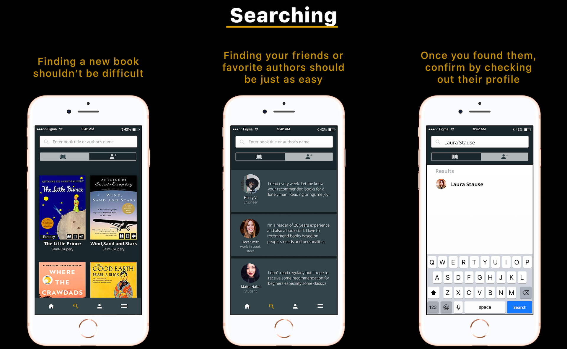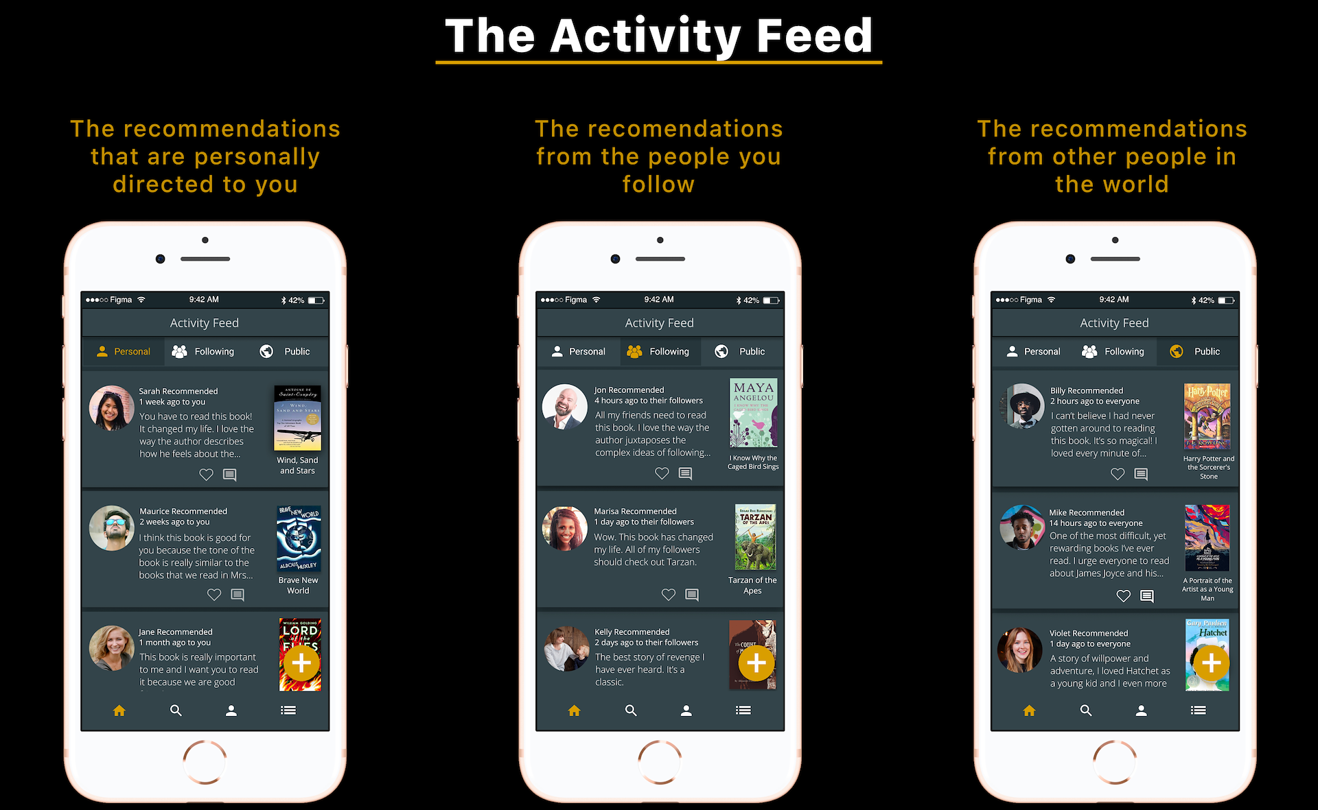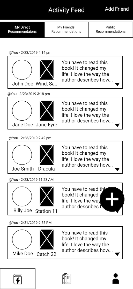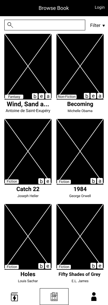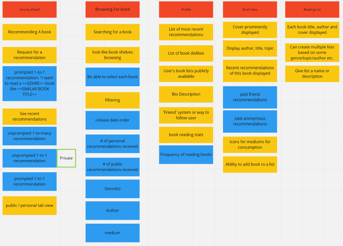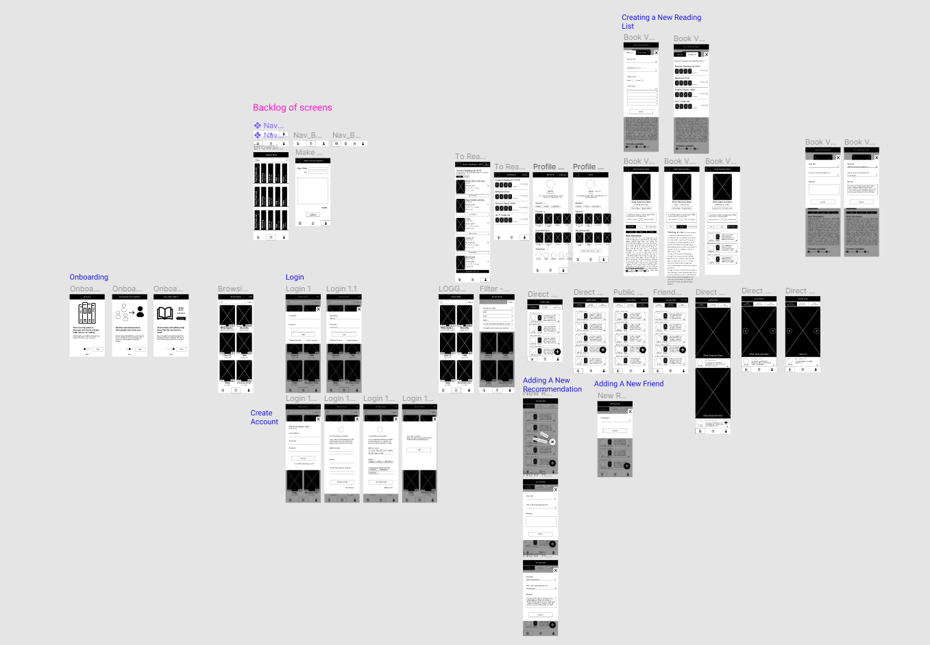 For better organization, determining flows and functionality I created a basic architecture using Real-Time Board(MIRO) This led to the structuring of 5 main pages; activity feed, book browser, profile, book view, and reading lists.