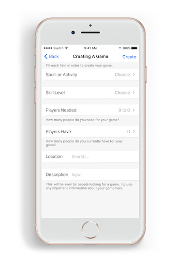 The main functionality of the application is the ability to either join an existing pick-up game or create a new one.