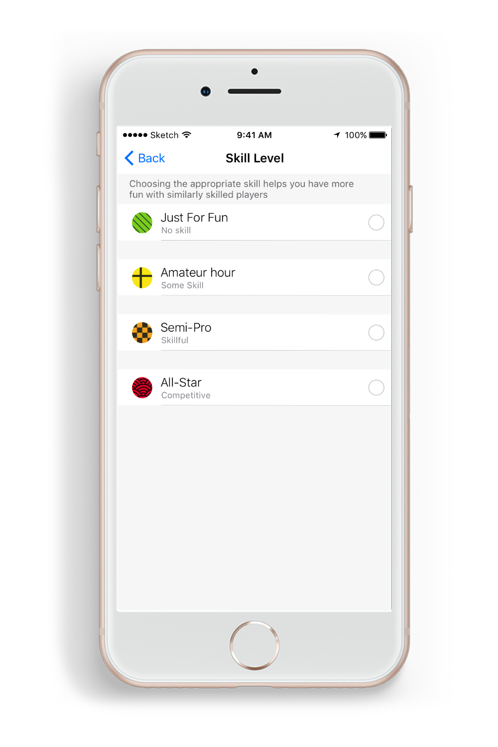 Another major finding was the idea of implementing aligning to skill and custom play preferences. When discussing with users, they mentioned that they refrain from playing sports because didn’t know who they can play with because of their skill level or being afraid to start because they’re “not that good”.